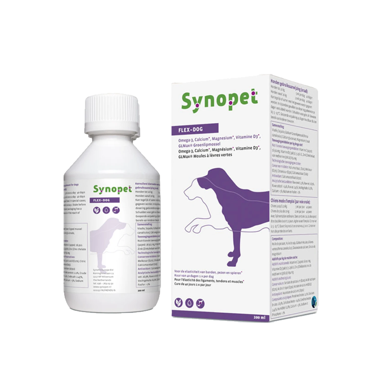 Bij de samenstelling van Flex-Dog is goed gekeken naar de oorsprong van de ingrediënten om de werkzame bestanddelen optimaal te benutten. De ingrediënten hebben een eigen bewerkingsprocedé en worden daarna samengevoegd tot de effectieve vloeibare Synopet Flex-Dog voor de spieren en pezen van honden. - Omega-3
