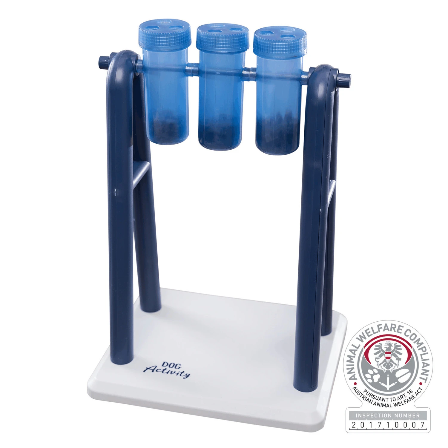 De Turn Around is een strategische hondenpuzzel in een verhoogde opstelling waarbij potjes gevuld kunnen worden om ze om te draaien voor een beloning.